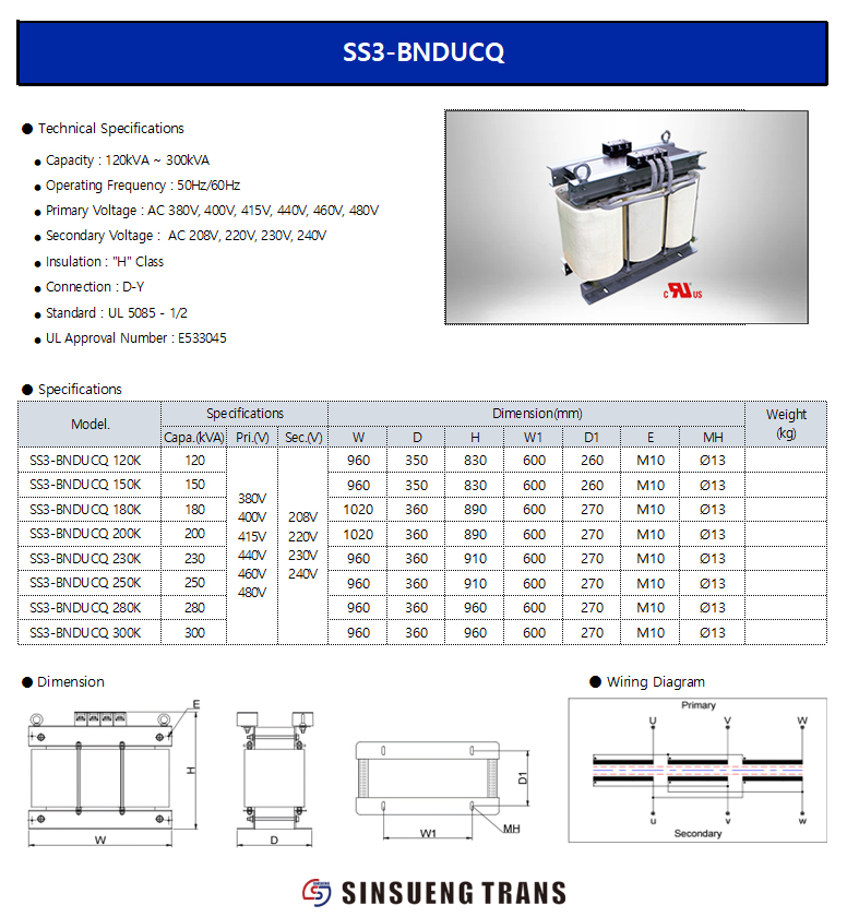 Secondary Voltage : 208V, 220V, 230V, 240V