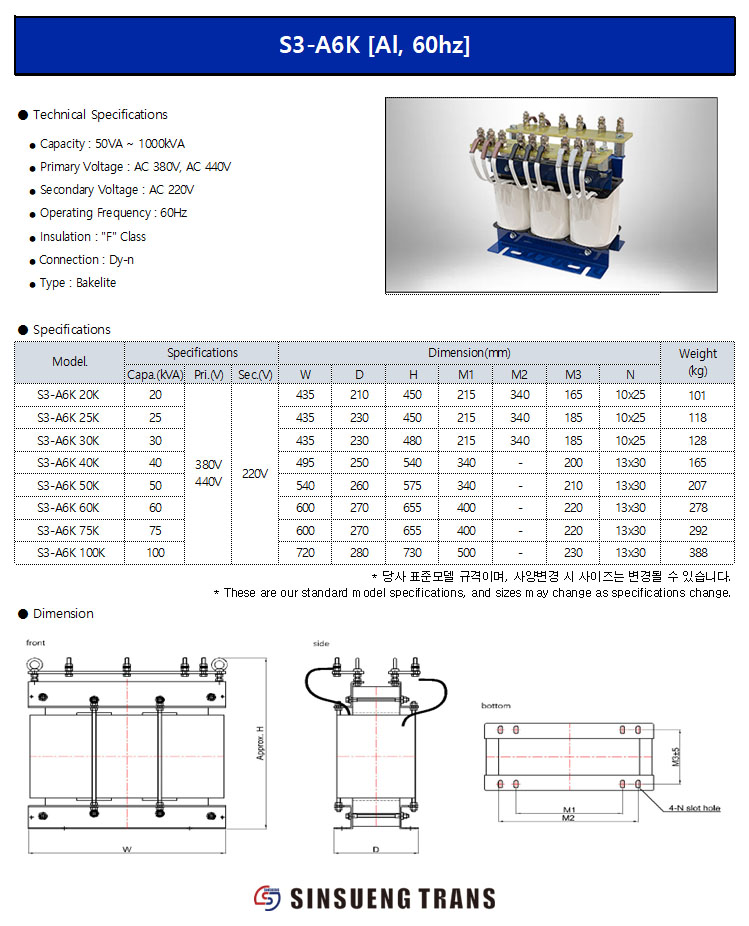 Capacity : 50VA ~ 1000kVA Frequency : 60Hz Primary Voltage : 380V, 440V Secondary Voltage : 220V Insulation : "F" Class Type : Bakelite Connection : Dy-n
